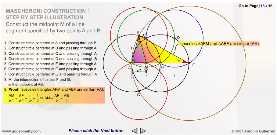 Use the Previous and Next buttons above to browse through the 16 steps. Mascheroni construction: Construct the midpoint of a line segment. Mascheroni or Mohr-Mascheroni Construction